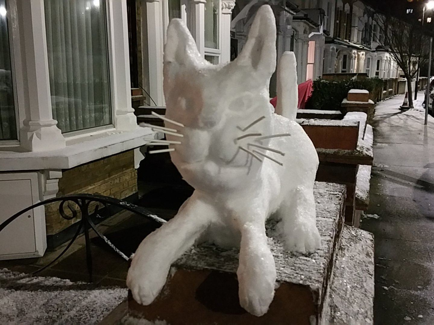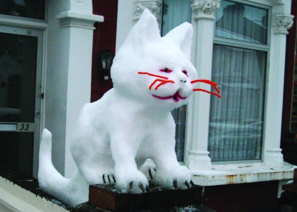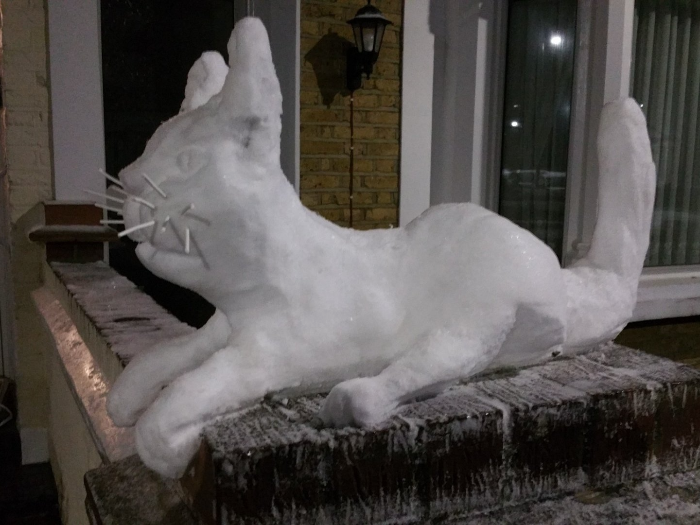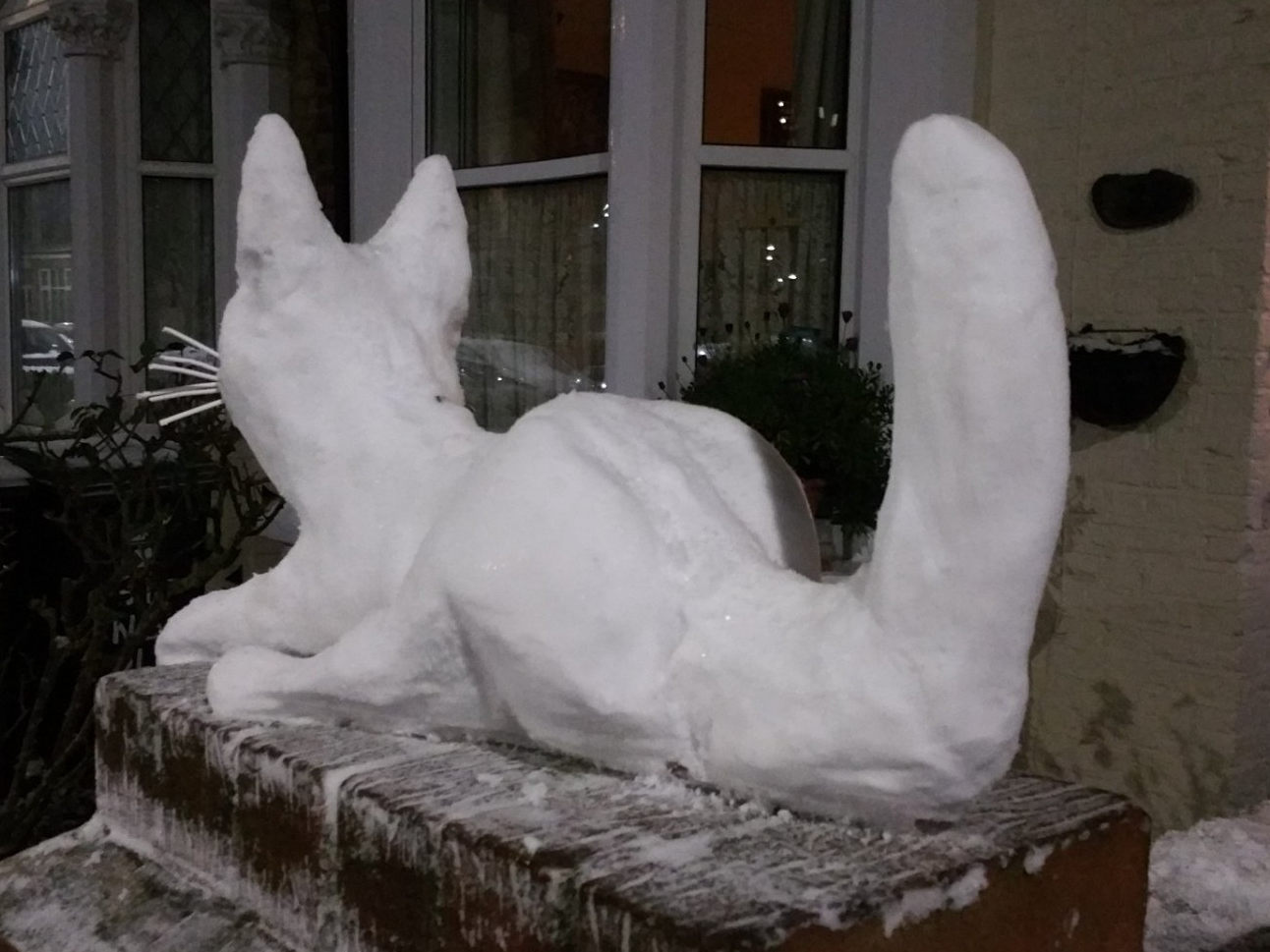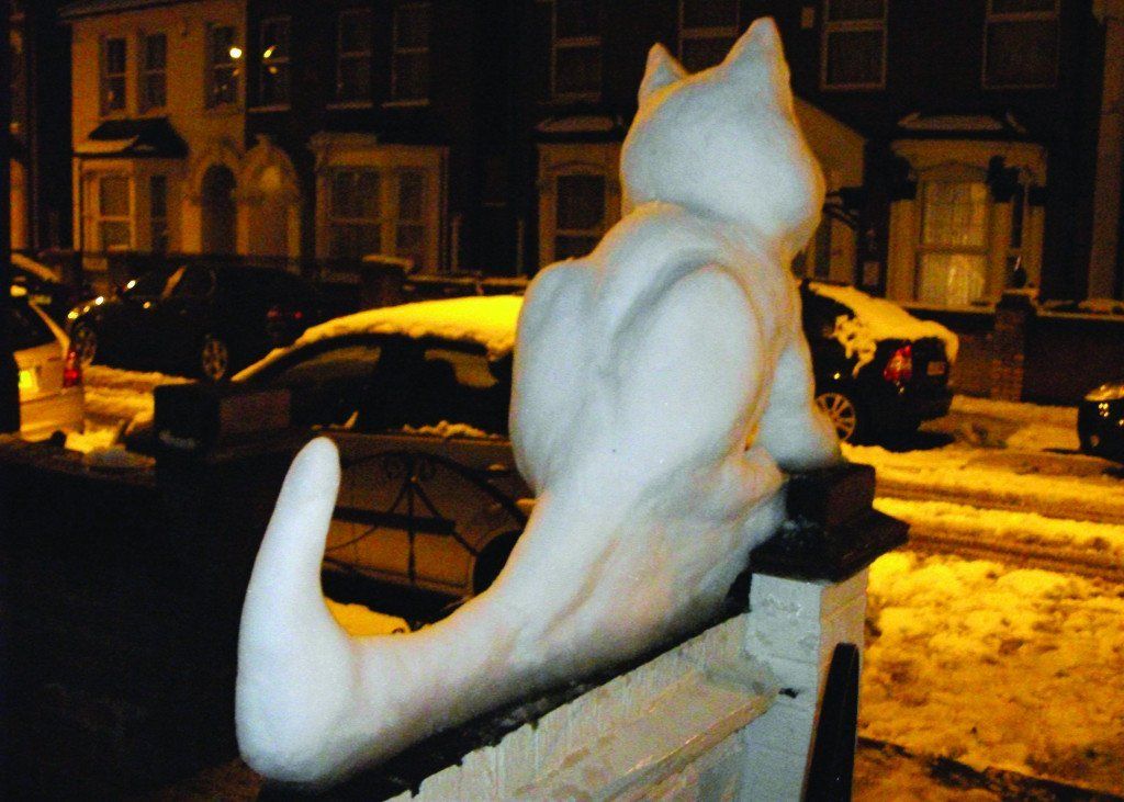 Familiar with cats having had 2, when there was heavy snow I produced a sitting cat over a few hours taking into account anatomy mostly with bare gloved hands & a year or two later made the snow cat head that was published in local and university press.